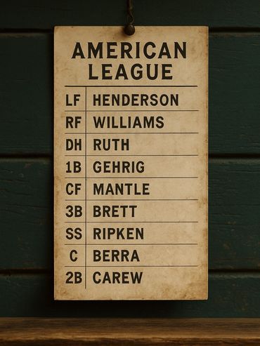 Starting Lineup: Rickey Henderson (LF), Ted Williams (RF), Babe Ruth (DH), Lou Gehrig (1B), Mickey Mantle (CF), George Brett (3B), Cal Ripken Jr. (SS), Yogi Berra (C), Rod Carew (2B).