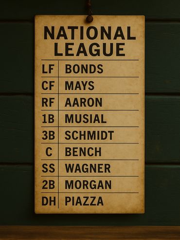 Starting Lineup: Barry Bonds (LF), Willie Mays (CF), Hank Aaron (RF), Stan Musial (1B), Mike Schmidt (3B), Johnny Bench (C), Honus Wagner (SS), Joe Morgan (2B), Mike Piazza (DH).